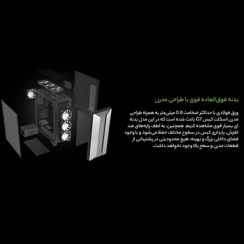 توضیحات سیستم خنککننده: ۷ عدد فن ۱۲۰mm فوق العاده کم صدا در قسمت جلو، سقف و پشت کیس (ARGB)